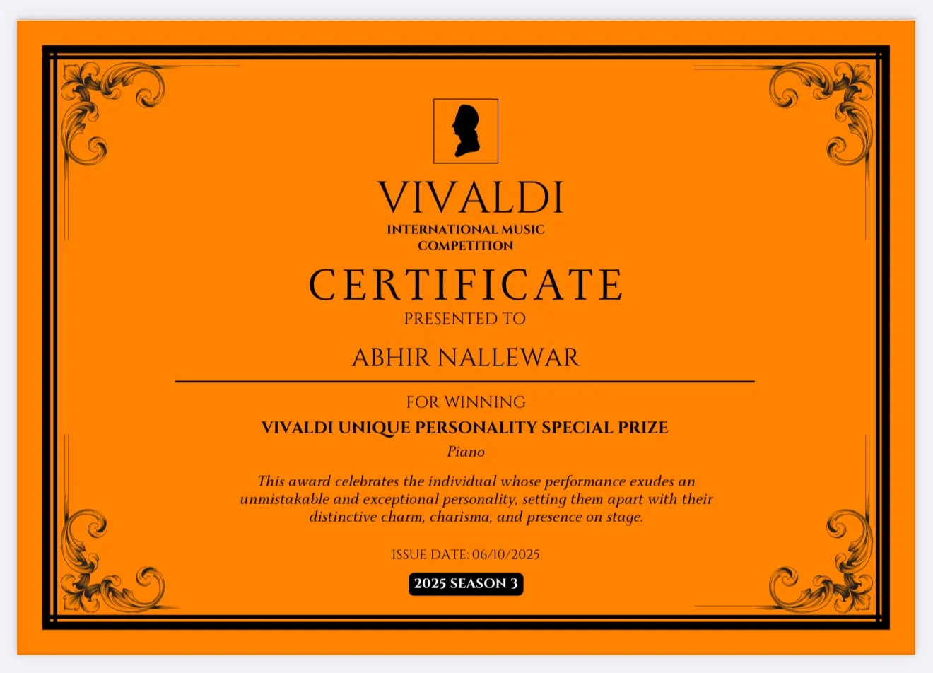 In addition to these prestigious awards, Abhir was also honored with the Vivaldi Unique Personality Special Prize — given to performers whose interpretation exudes an unmistakable charm, charisma, and stage presence. This special recognition highlights Abhir’s individuality as an artist, capturing the attention of both the judges and the audience.